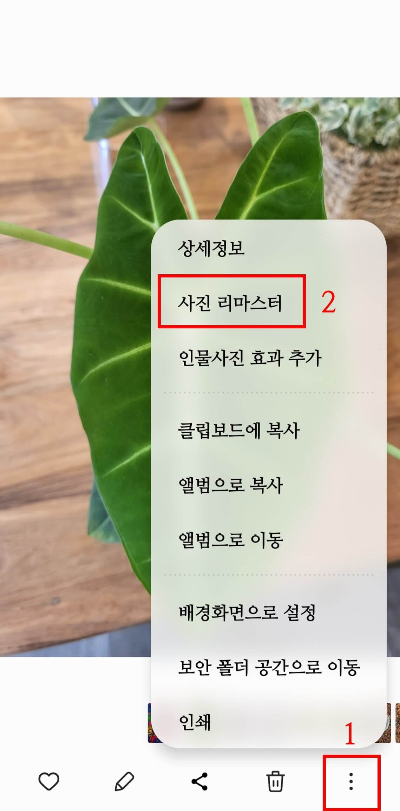 2. 하단의 점 세개를 눌러줍니다. 다음으로 사진 리마스터를 누릅니다. 그러면 사진 리마스터 중이라는 문구가 뜨고 보정이 시작됩니다.