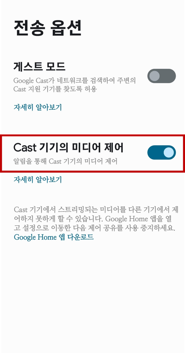 4. Cast 기기의 미디어 제어가 켜져 있을 겁니다. 옆의 버튼을 눌러서 꺼줍니다.